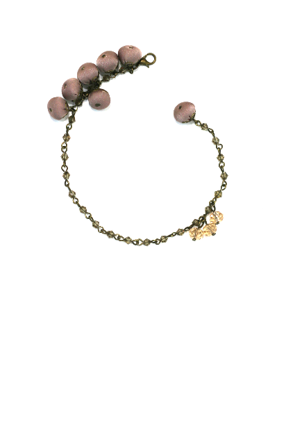 Bile textile executate manual din mătase naturală, cristale naturale de munte, lanț din bronz antichizat, detalii metalice hipoalergenice.