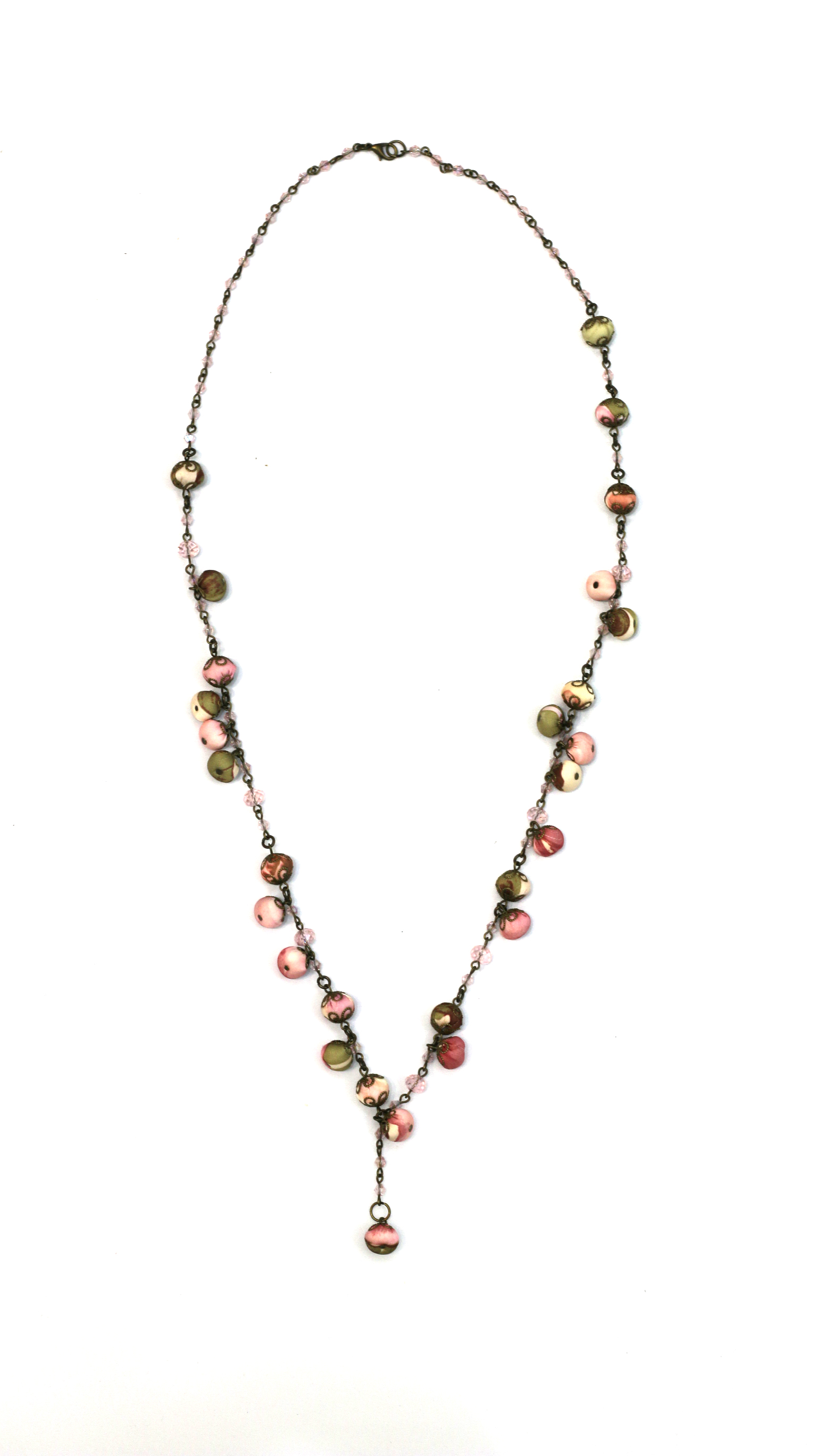 Bile textile executate manual din mătase naturală, cristale naturale de munte, lanț din bronz antichizat, detalii metalice hipoalergenice.