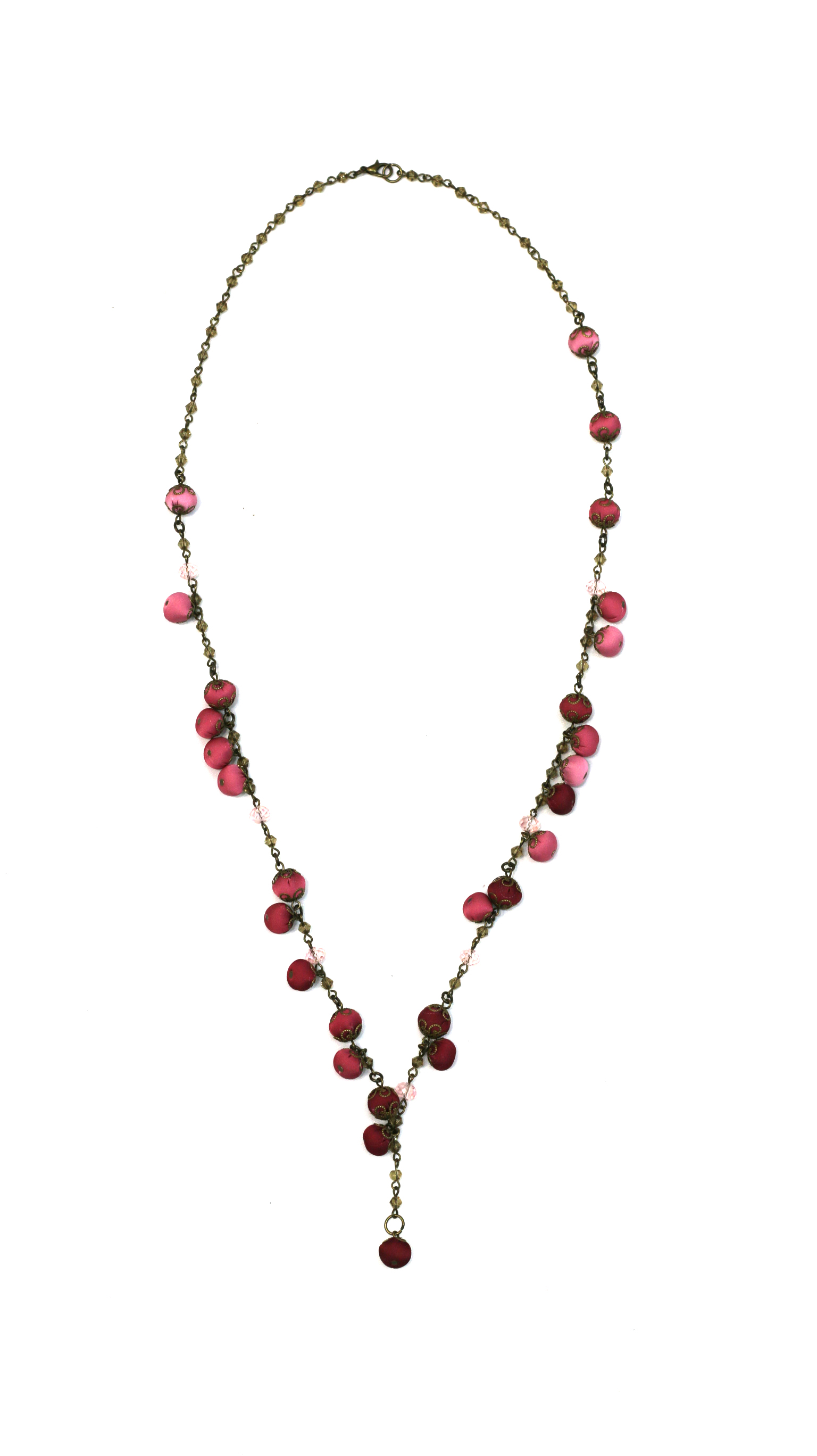Bile textile executate manual din mătase naturală, cristale naturale de munte, lanț din bronz antichizat, detalii metalice hipoalergenice.