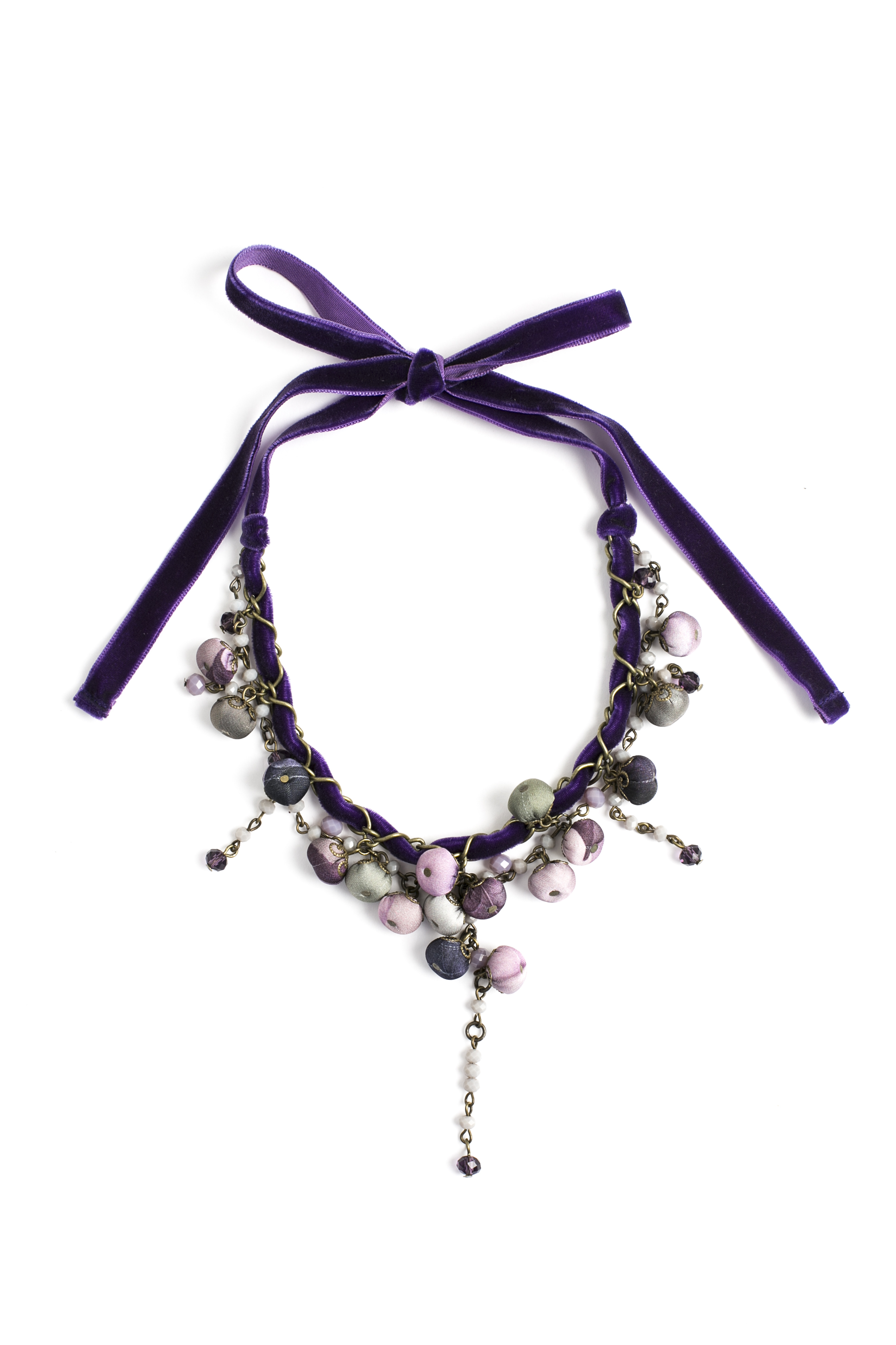 Colier la baza gâtului, cu bile textile, șiret de catifea, executat manual sută la sută.