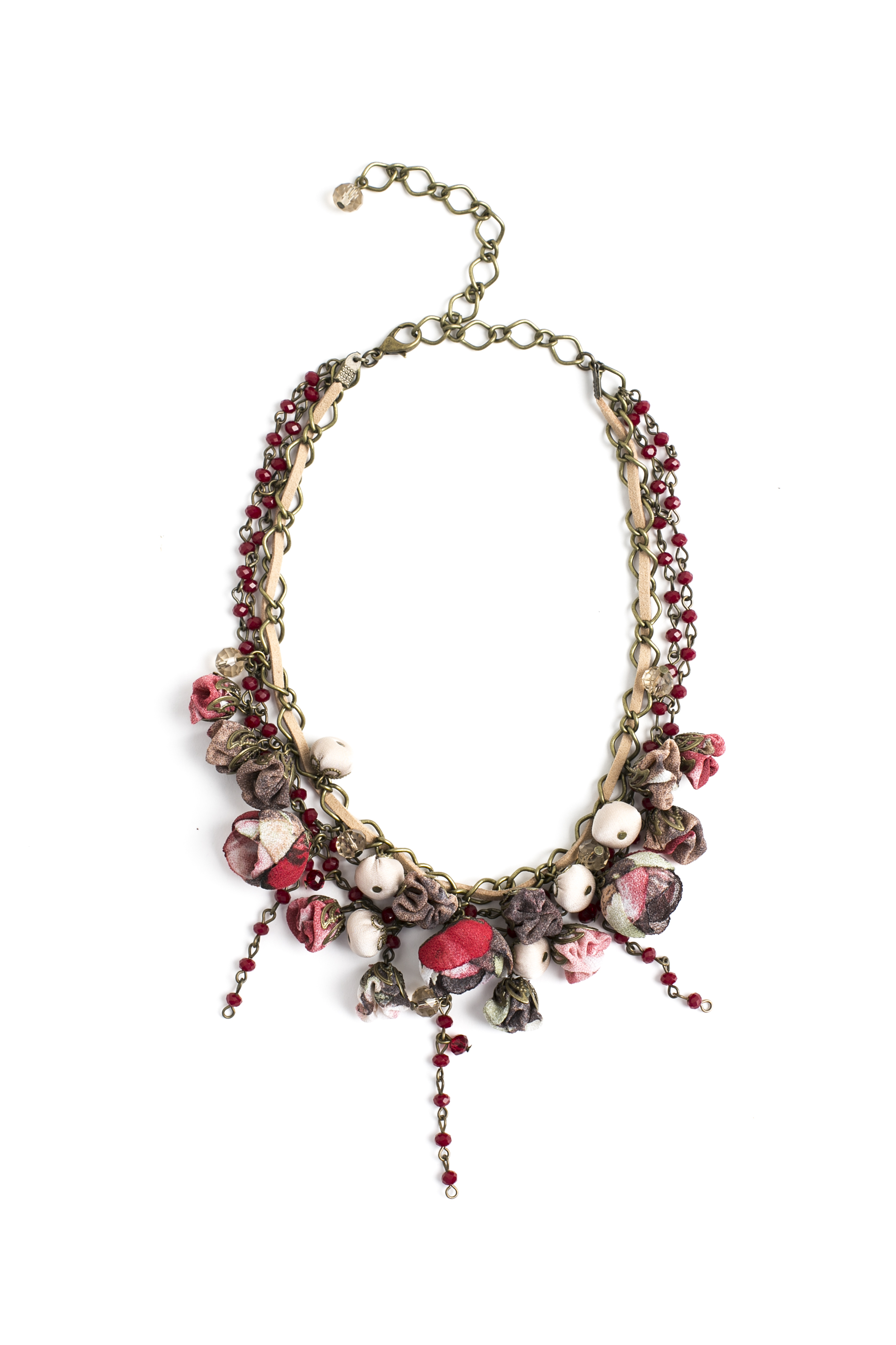 Elemente florale executate manual din mătase naturală, șnur din piele, cristale naturale de munte, lanț din bronz antichizat, detalii metalice hipoalergenice.