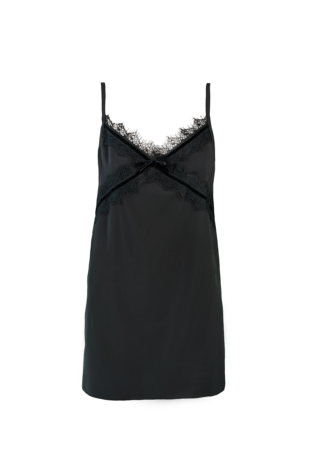 Rochie mini, semiajustată, cu tăietură delicată în partea dreaptă. Bretele ajustabile pentru un stil versatil, completat de dantela franceză și catifea, care păstrează individualitatea ei. Creat din țesături fine, face atingerea ușoară și delicată.