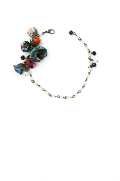 Elemente florale executate manual din mătase naturală, cristale naturale de munte, lanț din bronz antichizat, detalii metalice hipoalergenice.