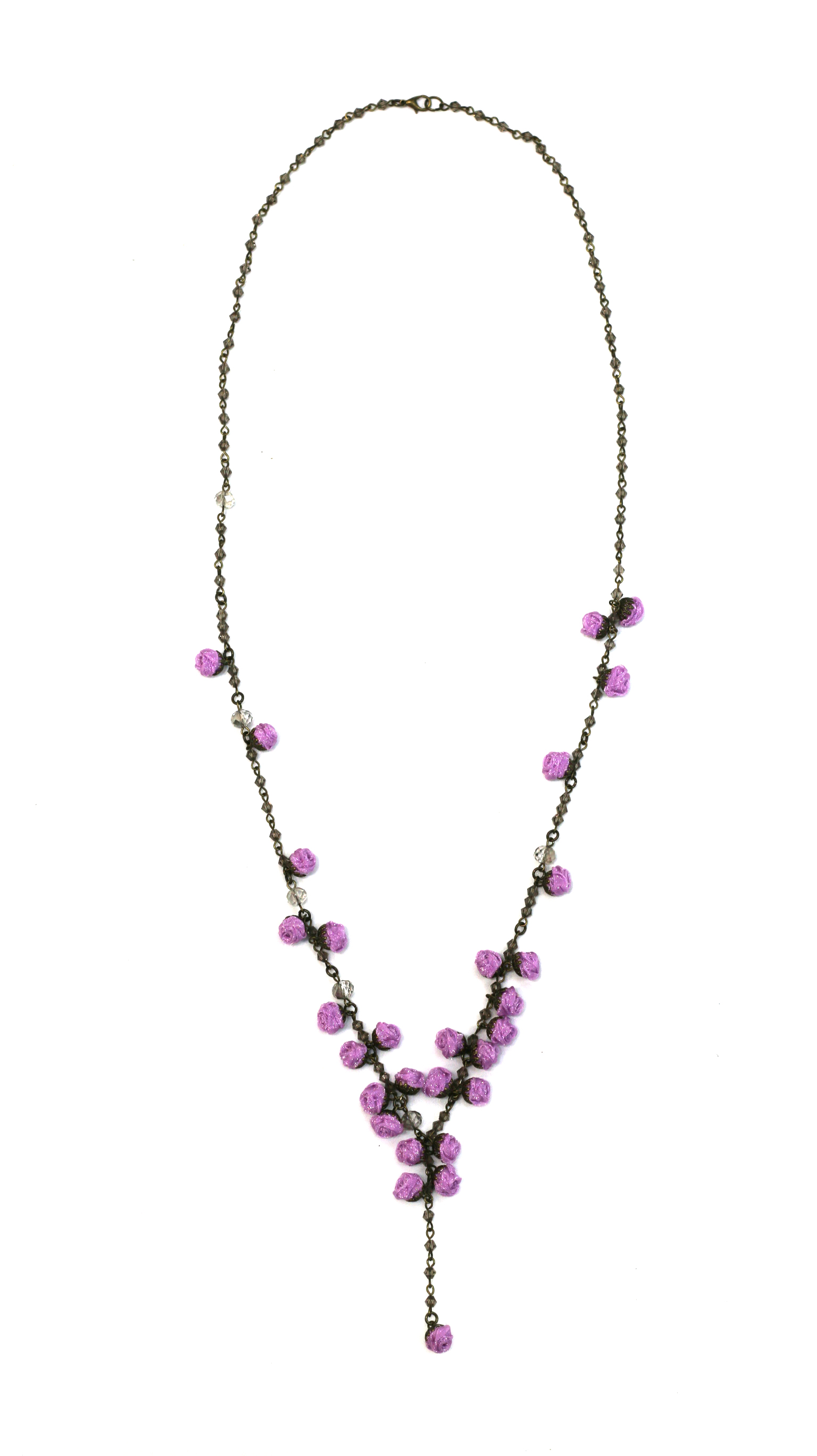 Trandafiri vintage executați manual din organza, cristale naturale de munte, lanț din bronz antichizat, detalii metalice hipoalergenice.