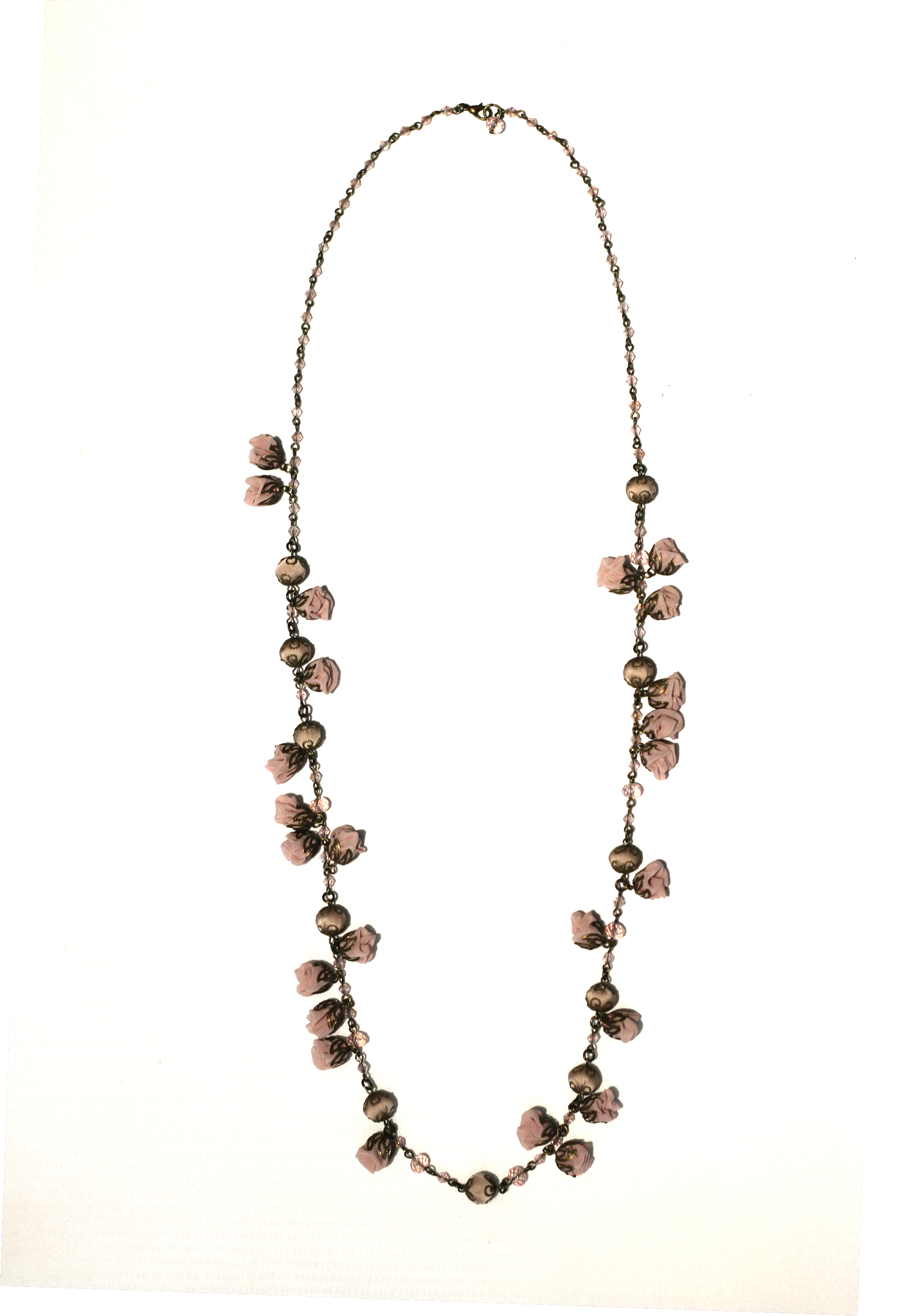 Colier cu lanț lung, creat dintr-un mix de elemente florale și bile textile din mătase, cu note fine de eleganță și de romantism. Executat manual sută la sută.