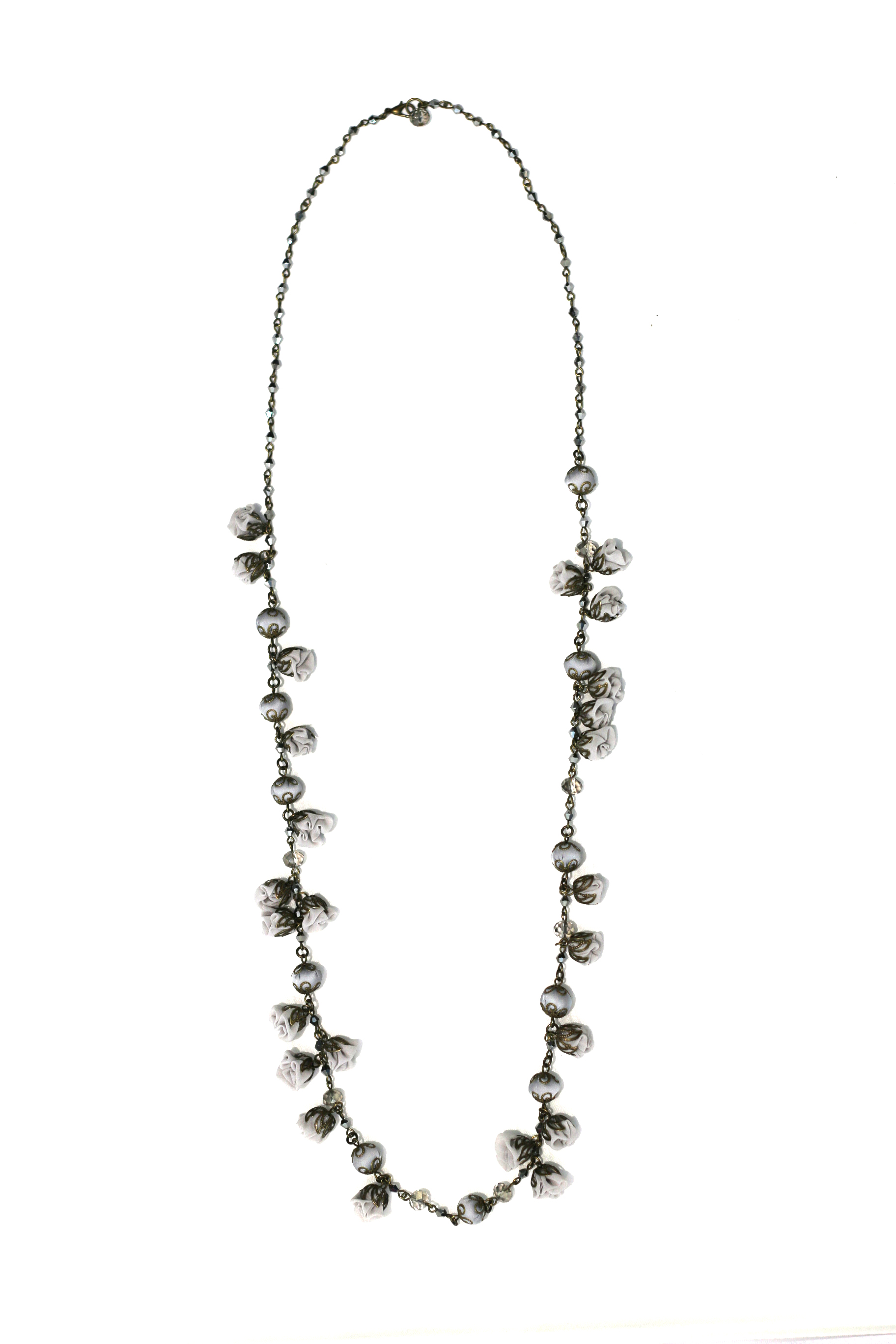 Colier cu lanț lung, creat dintr-un mix de elemente florale și bile textile din mătase, cu note fine de eleganță și de romantism. Executat manual sută la sută.